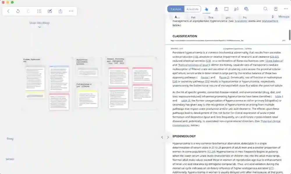 看文章时在编辑器里像往常一样高亮、批注,摘录出有用的段落;等有了些想法,就去思维导图区整理思路。高亮和批注可以直接加进导图里,互相关联,如此往复,省却在多个软件里跳转的麻烦。
