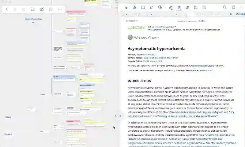把这两部分分别拎出来看,思维导图 App 和 PDF 阅读器里有的基础功能,这里面都有。但让 MarginNote 区别于其他软件的,就是「文档中高亮的部分可以自动加入思维导图中」——这个功能简直是为我写作流程中「收集信息」和「整理结构」这两步量身定做的。