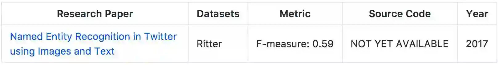 波恩大学 Diego Esteves 等研究者在推特上使用图像和文本进行命名实体识别,在该论文中,他们提出了一种新颖的多层级架构,该架构并不依赖于任何具体语言学的资源或解码规则。他们的新型模型在 Ritter 数据集上 F-measure 实现了 0.59 的优秀表现。