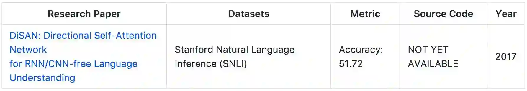 悉尼科技大学和华盛顿大学的研究者提出了 DiSAN,即一种为 RNN/CNN-free 语言理解的定向自注意力网络。该研究提出了一种新颖的注意力机制,即输入序列中每个元素之间的注意力是定向和多维的,这是一种对应特征相连接的注意力。该研究在斯坦福自然语言推理(SNLI)数据集上获得了 51.72% 的准确度。