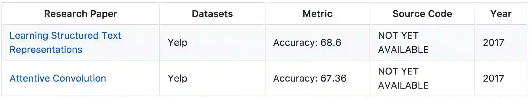 爱丁堡大学的 Yang Liu 等人提出了学习结构化的文本表征,在这篇论文中,他们关注于在没有语篇解析或额外的标注资源下从数据中学习结构化的文本表征。虽然目前暂时还没有相应的实现代码,不过他们在 Yelp 数据集上准确度能达到 68.6。而另一篇带注意力的卷积提出了了一种 AttentiveConvNet,它通过卷积操作扩展了文本处理的视野。