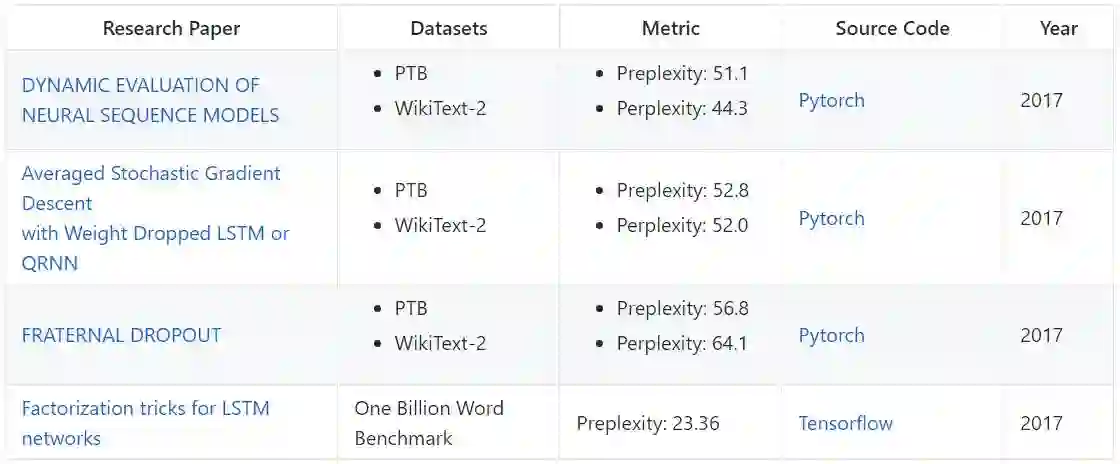 以下展示了语言建模方面当前顶尖的研究成果及它们在不同数据集上的性能。