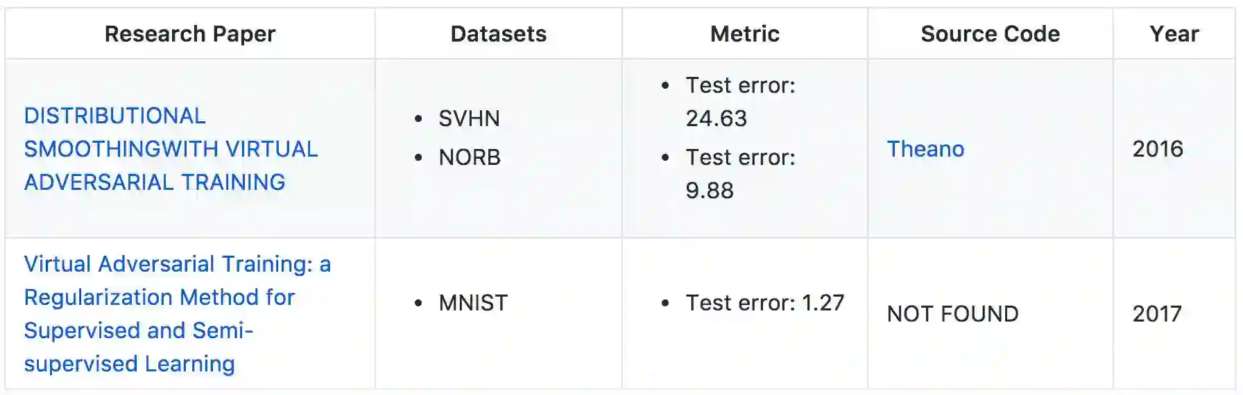 第二篇论文提出了一种基于虚拟对抗损失的新正则化方法:输出分布的局部平滑度的新测量手段。由于平滑度模型的指示是虚拟对抗的,所以这一方法又被称为虚拟对抗训练(VAT)。VAT 的计算成本相对较低。本文实验在多个基准数据集上把 VAT 应用到监督和半监督学习,并在 MNIST 数据上取得了 Test Error 1.27 的优异表现。