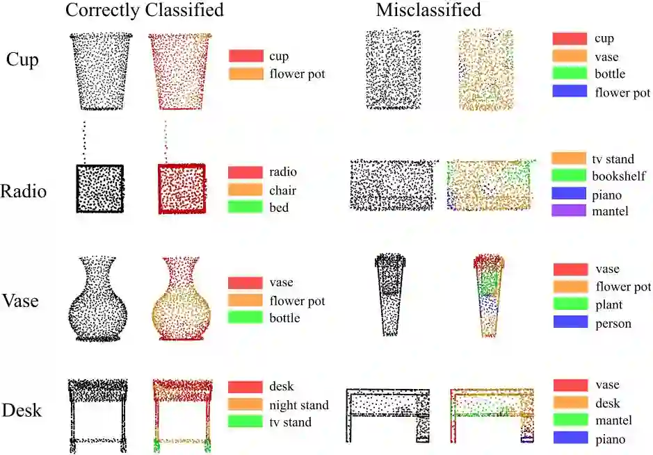 本文提出的 C-PointNet 可以在达到与 PointNet 对等的分类精度下(88.0%)探索网络决策的过程。如图 3 所示,正确分类的点云中的大部分点都对预测标签有贡献,但是被错误分类的点云中的点可能对其他标签有贡献。图 4 进一步展示了当一对点云具有相似的形状时,其类别特征响应图也可能很相似,这意味着这两类点云很容易被错误分类。