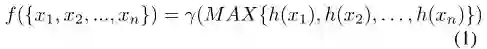 对于上述的第一个问题,可以从两个方面考虑:全局特征中每个维度都学习到了什么;全局特征中每个维度的重要性如何。给定无序点云集合{x1, x2, ..., xn},PointNet 可以定义为一个集合的函数 f,将一个集合映射为一个向量,如下式所示,其中 r 和 h 是多层感知机 MLP 网络: