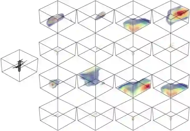 从图 2 可以看出每个点函数可以检测一定范围内的点,并且有不同的激活值。以飞机为例,不同的点函数可以对机翼、机头、机尾等产生响应。另一个发现是各个点函数的激活区域有很大的重叠,这样的好处是当其中一个函数未成功检测时,其他的函数仍可以检测到重要的部分。但是这样也造成了太多冗余的信息,也会损害网络的可解释性。