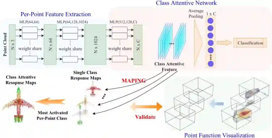 解释PointNet的过程如图1所示,首先,可视化点的函数,随后使用C-PointNet来提取细致的类别全局特征(包含逐点特征提取和类别特征提取)。最后计算类别相关的特征响应来探索决策过程。