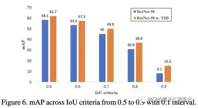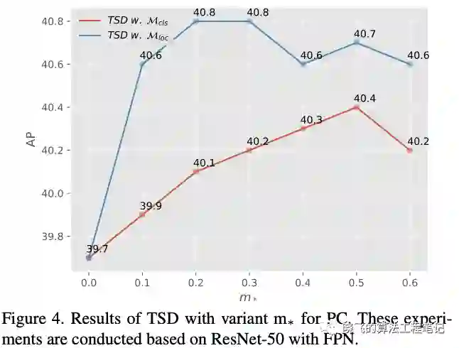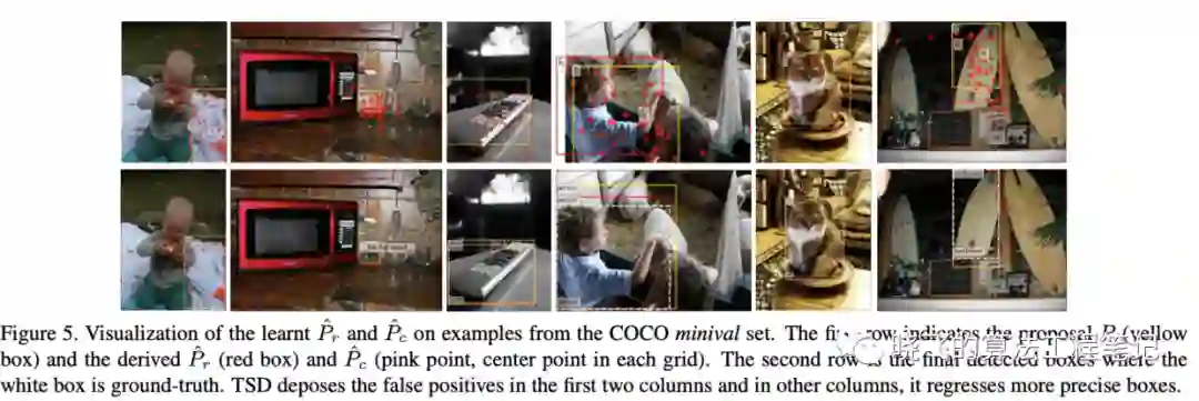 从图5可以看出,TSD的定位能够学习不易回归的边界,而分类则专注于局部特征以及目标的上下文信息,这里的点为区域 转换后的中心点