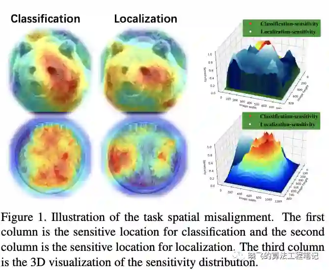 经典RoI-based定位算法使用sibling head(2-fc)对proposal同时进行分类和回归,由于任务的本质不同,分类任务和定位任务是完全不同的,关注的特征也不一样,如图1所示。分类任务往往需要平移不变性,而定位任务则需要平移可变性。