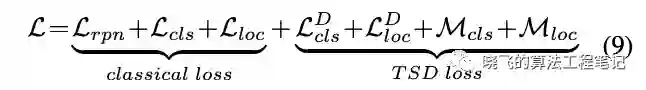 如图2所示,在训练时,TSD和原来的结构共存,定义主干输出的预测框为 ,TSD输出最终的定位结果 和最终的分类结果 ,原sibling head输出的结果为 ,GT为 ,类别为