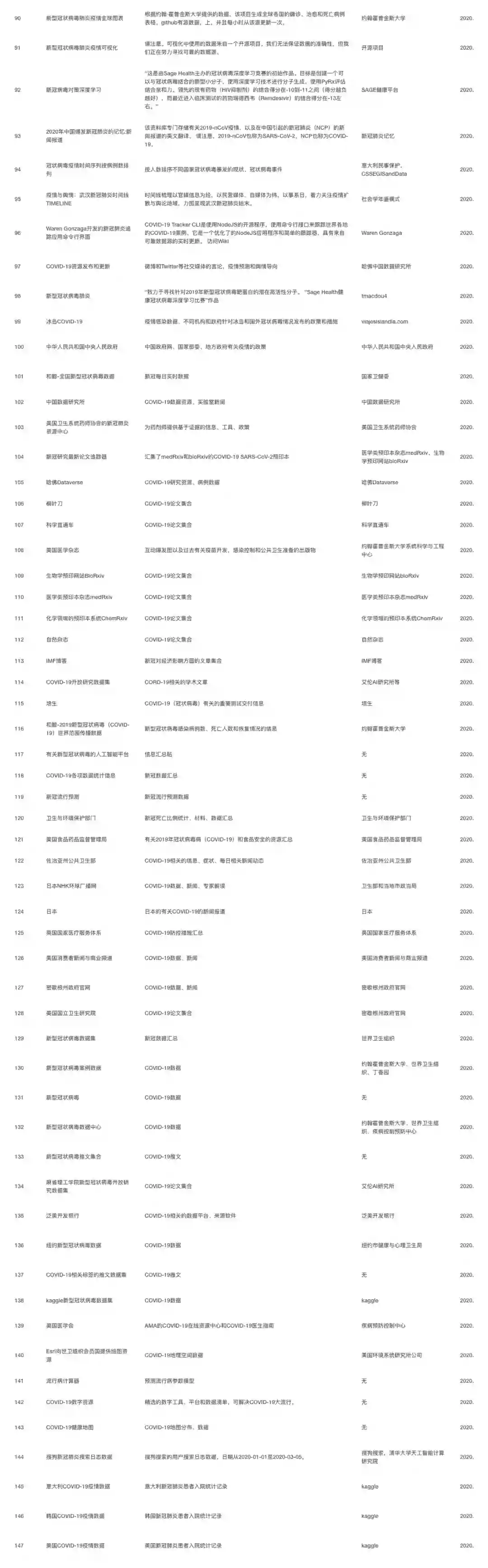 新冠肺炎(COVID-19)开放数据源,旨在汇集世界上最全面的新冠肺炎开放数据源。自疫情发端即致力于收集来自世界各地各种类型的相关开放数据,并保持持续更新。