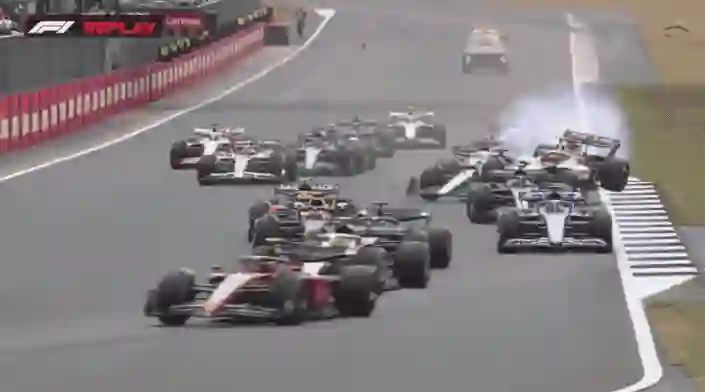 就在F1英国大奖赛正赛的起步阶段,一场严重事故不幸发生。