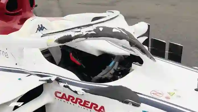中国选手周冠宇与英国选手拉塞尔的赛车出现相撞: