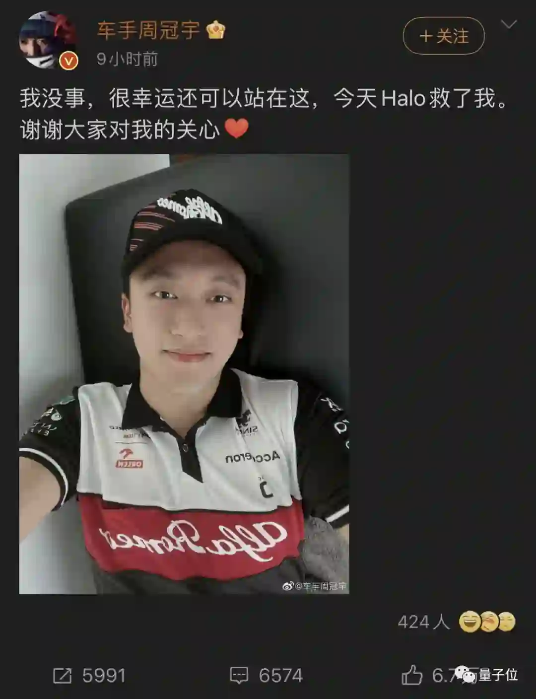 周冠宇在微博中还重点提到了“Halo”,表示是它“救了我”。