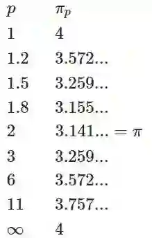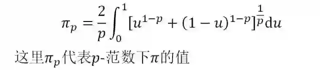 上面图像是范数p的取值与π关系。横坐标为范数p的取值,纵坐标是在不同范数的情况下“圆周率”的取值。图像是依据下面展示的公式绘制的。最后给出一组具体的数值供同学们参考。