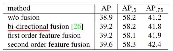 对比的baseline为没有进行网格点融合的形式,first order是进行了一阶融合,second order是在一阶融合的基础上增加了二阶融合的措施。特别的,可以看到这种策略对于AP.75的影响要大于AP.5,这说明特征融合策略对于边框定位准确度十分有效。
