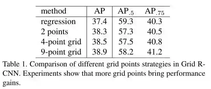 对比了传统的回归算法,在2-point使用真实框的左上角和右下角的点,在4-point中增加了另外两个角点的监督,9-point就是论文示例中的普通3x3grid。其最后的结果显示,越多的grid point监督效果越好。