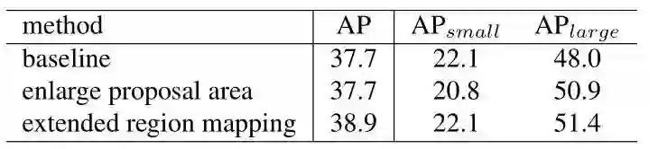 对比了没有做任何措施、直接扩大region proposal以及使用该表映射关系的方法,可以看到直接扩大region proposal虽然对大物体检测区域有提高,但由于引入了背景和其他目标,对小目标的检测却十分不利。