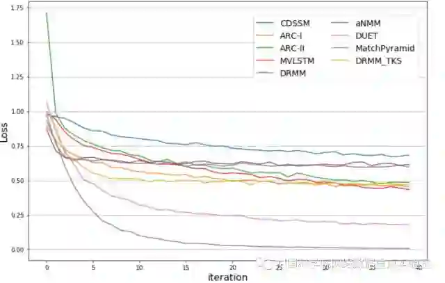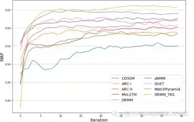 由于WikiQA数据量大小的限制,这里ARC-I, ARC-II, MV-LSTM, DRMM, aNMM, DUET, MatchPyramid, DRMM_TKS都使用了预先训练好的Glove[10]词向量来初始化单词表达。这里的评价指标的得分是根据在验证数据集上的MAP指标选出的最佳模型在测试数据集上计算所得。由于WikiQA是一个排序的问题,这里统一采用的是pair-wise的hinge 损失函数。不同模型在训练数据集上的损失曲线如下图1所示,同时,不同模型在测试数据集上的MAP指标如图2所示。