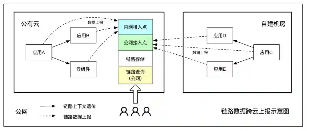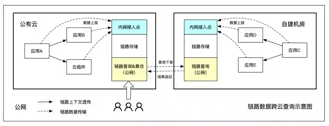 混合模式是指将统计数据通过公网统一上报,进行集中处理(数据量小,精度要求高),而链路数据采用跨云查询方式进行检索(数据量大,查询频率低)。