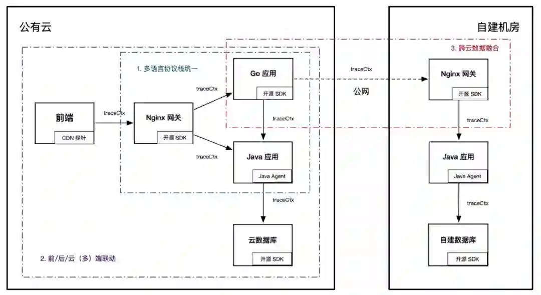 全链路追踪的价值与覆盖的范围成正比,它的挑战也同样如此。为了最大程度地确保链路完整性,无论是前端应用还是云端组件,无论是 Java 语言还是 Go 语言,无论是公有云还是自建机房,都需要遵循同一套链路规范,并实现数据互联互通。多语言协议栈统一、前/后/云(多)端联动、跨云数据融合是实现全链路追踪的三大挑战,如下图所示:
