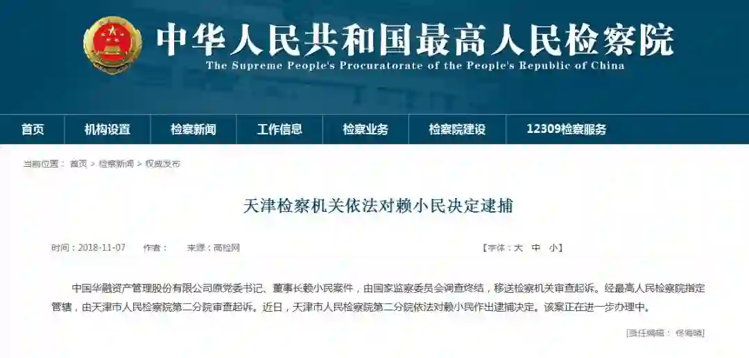 据最高检11月7日消息,中国华融资产管理股份有限公司原党委书记、董事长赖小民案件,由国家监察委员会调查终结,移送检察机关审查起诉。经最高人民检察院指定管辖,由天津市人民检察院第二分院审查起诉。近日,天津市人民检察院第二分院依法对赖小民作出逮捕决定。该案正在进一步办理中。