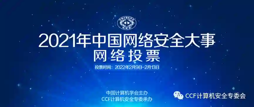 由中国计算机学会主办,中国计算机学会计算机安全专业委员会承办的的2021中国网络安全大事评选活动,网络投票将于2022年2月9日-2月13日举行。希望所有关心和支持网络安全的同仁积极参与投票活动,期待您的投票。
