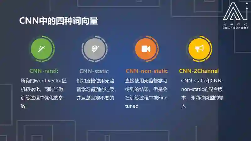 第三种,就是 CNN-non-static,它直接使用无监督学习 pre-training 的结果,但是在训练的过程当中,会进行一个细致的微调,这样效果会更好一些。这样一个微调会保证你的原始的 word vector 不会太远,同时它能够针对实际的对业务问题做一个更好的优化。