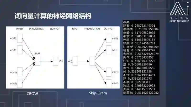 这两种网络结构能够将词最后结合大规模的语料,训练出所有词的语义向量,每个向量之后,对应的每个词都能将它最相似的向量计算出来。比如上图中的“好看”、“很漂亮”、“难看”、“喜欢”,这些都是跟“漂亮”在语义上特别近似的。