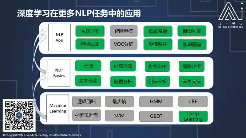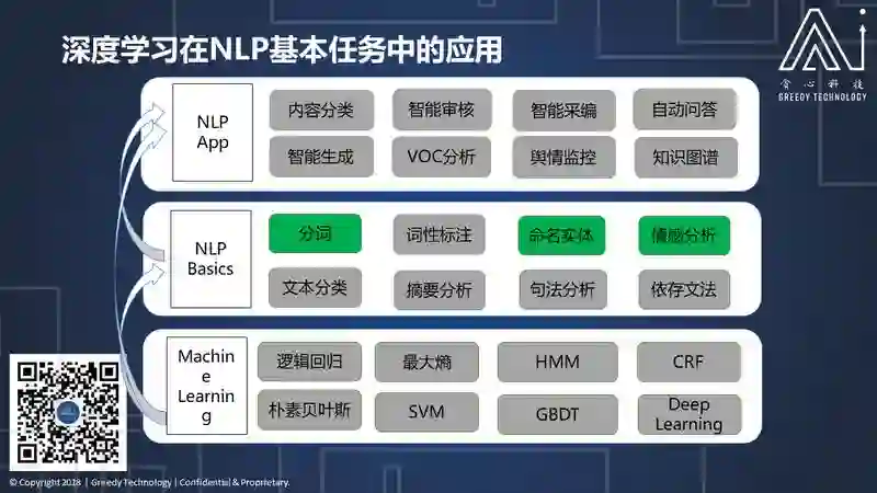 最上面一层是 NLP 的各种应用的场景,比如说智能审核、智能采编、自动问答,以及文本的自动生成、知识图谱等等,他们也会用到中间层的各种基本的 NLP 模块。