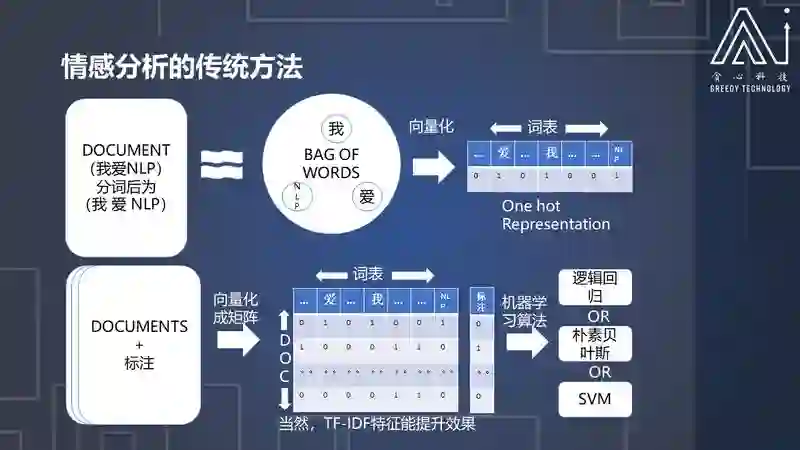 我在 2014 年的时候做了一个项目,客户当时需要的就是情感分析。那时候我们都是用传统的方法做得,具体来说首先第一步,肯定要将文本中的词向量化,我们经常用 one hot representation 来表示,比如这个词表里面有一万个词,那么这个向量长度就是一万,对于每个词都会有个固定的位置,这个位置上取 1,其他的位置上取 0,我相信很多同学对这块比较了解。将其中的词向量化之后,那么接下来再结合这种传统的逻辑回归,特别是 SVM,我就能去结合标注数据进行模型的训练,就能进行情感分析的预测,这是用传统方法来做。
