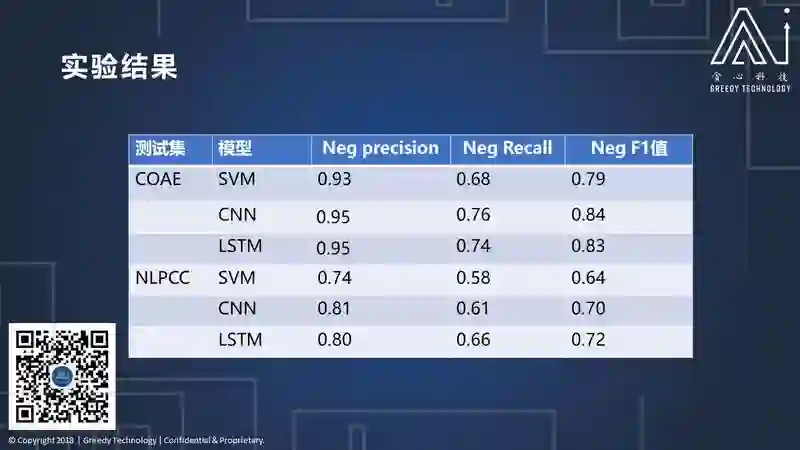 我们在 COAE 和 NLPCC 这两个情感分析测试集上进行了测试,传统模型就采用 SVM,同时也采用了 CNN 和 LSTM,我们看得出来,在 COAE 数据集上我们提升了四到五个百分点,在 NLPCC 上我们大约是提升了六个百分点,效果比传统的模型是有显著的提升的。