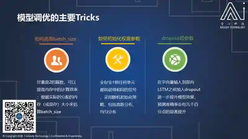 刚我们讲述了 LSTM+CRF 整个模型的原理网络结构,那么我们实际在开发的过程当中,在做项目的过程当中,我们同时使用了一些模型调优的技巧,这些技巧是非常重要,是大家在实际去做深度学习这块工作的时候需要去掌握的。