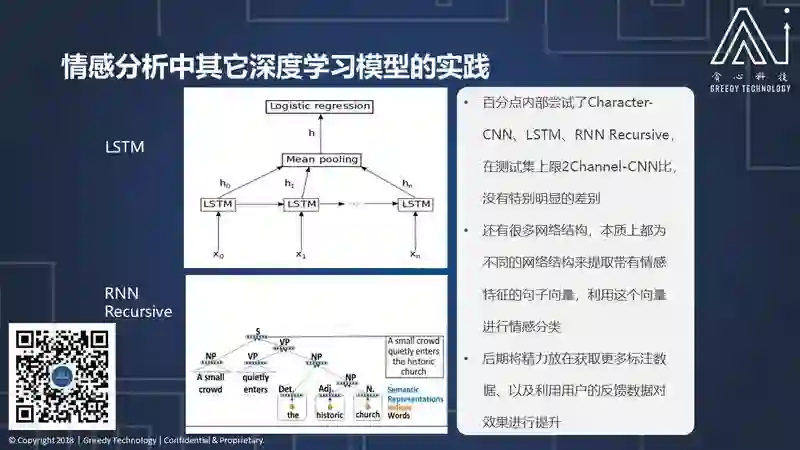 我们当时在内部采用了不少其他的模型,比如 character-CNN、LSTM,还有递归神经网络,我们在测试集上发现跟目前采用的 2channel-CNN 相比没有明显的差别,另外还有其他的一些网络结构,比如 GRU 等等,本质上都是为不同的网络结构提取带有情感提升的句子向量,利用这些向量进行情感分类,并没有本质的差别。因此,我们后续更多优化的精力是获取更多的标注数据,以及在我们的情感应用产品上,结合用户的反馈数据进一步的发力。