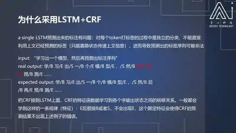 可能也有同学在想:直接采用 LSTM 就能对输出的训练进行标注了,为什么后面还要接个 CRF 模型,计算复杂度反而提高了,那么它到底带来什么样的好处?