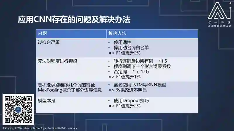 第二个,我无法对词的重要程度进行模拟。比如说一句话:你很好,但是你没有耐性。这个“但是”后面表达意思比前面的表达意思要更加重要,因为我们将转折词后面的词语乘以 1.5 的加权,这是一个经验的取值,然后我们在程度副词下,要加一个形容词乘以系数,比如:你非常的美,或者:你非常的勤奋,“非常”这样一个程度副词它要进行一定的加权,它的情感会更加强烈。对于否定词,譬如:不好或者不努力等等,在训练过程当中你要乘负的系数。通过这种方式,去模拟这些词表达一种语义和情感的程度,我们的 F1 值提升了 1%。