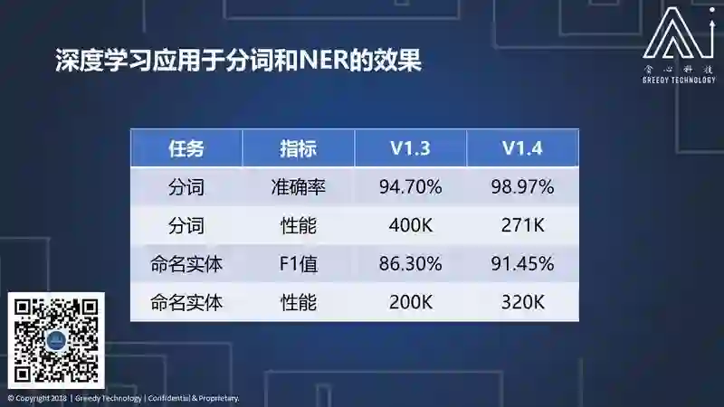 经过这样一个 1.4 的版本,我们非常有自信对外说:我们在分词与命名实体这两个任务上面的效果,现在应该是非常领先的水平。在这几个方面,我们也跟国内的一些企业经过了三到四轮的 PK,之后都赢了下来,在这一领域,我们还是做了很多比较扎实的工作,也取得了很好的成绩。