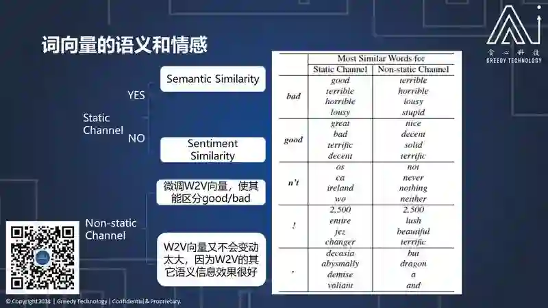 对于这种 non-static channel 这种动态的向量,它能够在训练过程当中微调,结合情感分析的标注数据进行微调,它能够区别正面或者负面的情感。还是对这个词, Bad,经过 non-static channel 动态向量训练,最后首先匹配的相似词是 terrible,horrible 等等,这些都是负面相关的词语。通过这种动态的调整,模型甚至能够把这种情感学习到,因此,它在情感中取得更好的效果。