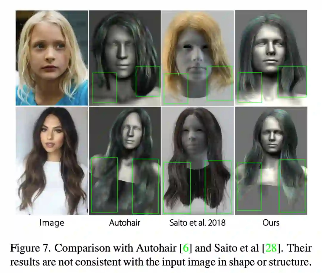 这里还将重建结果与 Autohair[6]和 Saito[28]进行了比较。如图 7 所示,虽然 Autohair 可以合成真实的结果,但结构上不能很好地匹配输入图像,因为数据库包含的发型有限。另一方面,Saito 的结果缺乏局部细节,形状与输入图像不一致。相比之下,本文方法的结果更好地保持了头发的全局结构和局部细节,同时确保了头发形状的一致性。