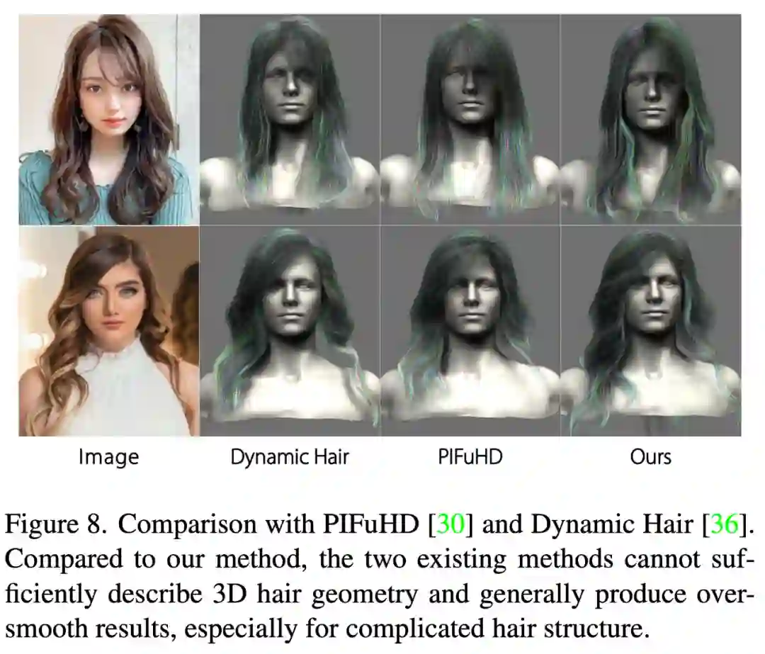 PIFuHD [30]和 Dynamic Hair [36]则致力于估计高保真度的 3D 头发几何特征,以生成真实的发丝模型。图 8 展示了两个有代表性的比较结果。可以看出,PIFuHD 中采用的像素级隐函数无法充分描绘复杂的头发,导致结果过于光滑,没有局部细节,甚至没有合理的全局结构。Dynamic Hair 可以用较少的细节产生更合理的结果,而且其结果中的头发生长趋势可以很好地匹配输入图像,但许多局部结构细节 (例如层次结构) 无法捕获,特别是对于复杂的发型。相比之下,本文的方法可以适应不同的发型,甚至是极端复杂的结构,并充分利用全局特征和局部细节,生成高保真、高分辨率的具有更多细节的 3D 头发模型。