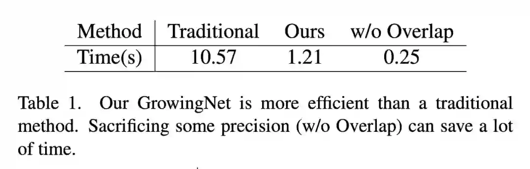 如图 4 和表 1 所示,与传统的头发生长算法相比,本文的 GrowingNet 在时间消耗上具有明显的优势,同时在视觉质量上保持了相同的生长性能。此外,通过比较图 4 的第三列和第四列,可以看到,如果没有重叠潜在 patch 方案,patch 边界处的发丝可能是不连续的,当发丝的生长方向急剧变化时,这个问题就更加严重。不过值得注意的是,这种方案以略微降低精度为代价,大大提高了效率,提高效率对于其方便、高效地应用于人体数字化是有重要意义的。