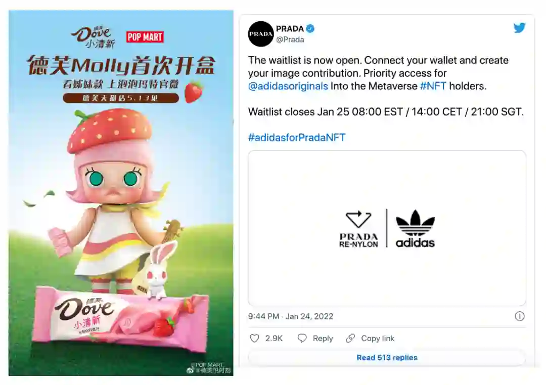 例如近年来泡泡玛特就一直是颇受欢迎的跨界联名对象,从食品饮料、美妆护肤到咖啡茶饮、时尚轻奢,众多领域里的品牌都曾与其联名。今年奢侈品牌、运动品牌和潮流服饰品牌也都“卷”进了NFT领域,Gucci、Prada、adidas、李宁等品牌都选择在联名时推出NFT系列产品。