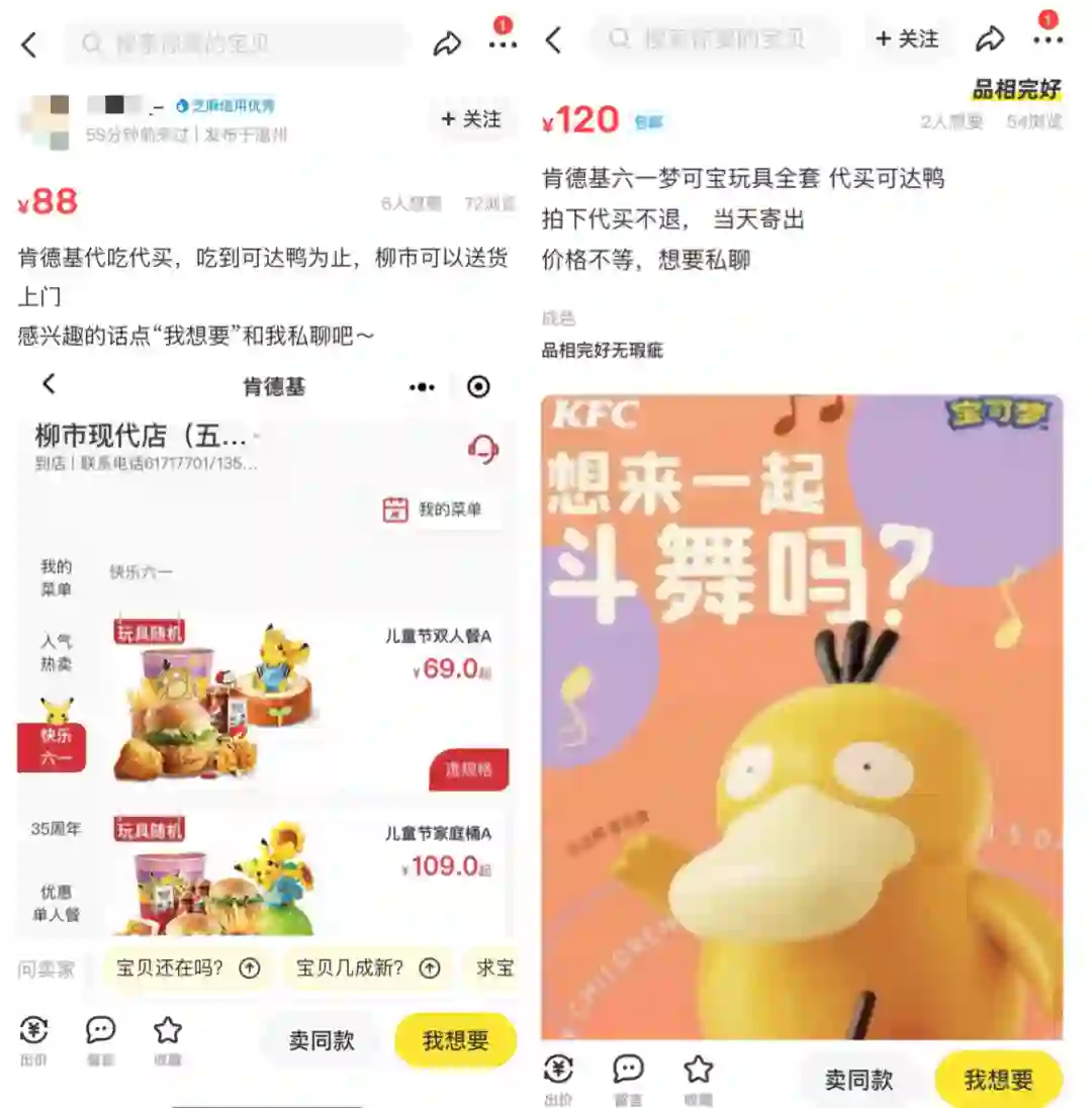 今年年初,肯德基联名泡泡玛特推出了一款可以获得盲盒的套餐,率先买到的人在社交平台上晒着“战绩”,“代吃”业务被催生出来,有人一次性花费上万元买套餐也成为热门话题。之后肯德基和宝可梦联名推出带有玩具的套餐,哄抢现象又出现,更多人听到“一鸭难求”呼声后反而也加入到了抢可达鸭的行列中。