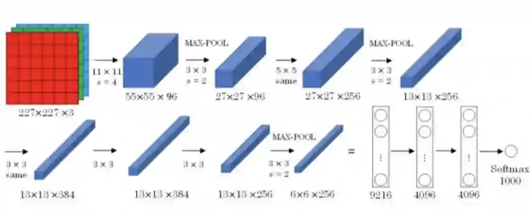 AlexNet模型是由Alex Krizhevsky、Ilya Sutskever和Geoffrey Hinton共同提出的,其结构如下所示:
