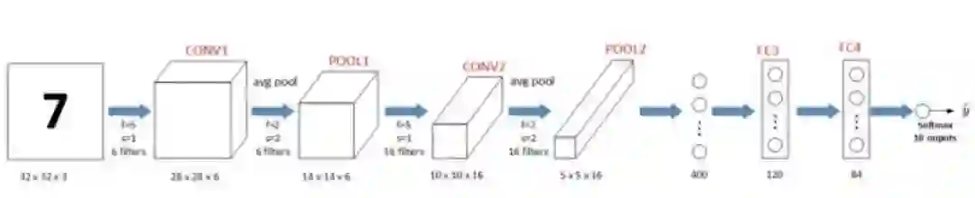 典型的LeNet-5结构包含CONV layer,POOL layer和FC layer,顺序一般是CONV layer->POOL layer->CONV layer->POOL layer->FC layer->FC layer->OUTPUT layer,即 y^。下图所示的是一个数字识别的LeNet-5的模型结构: