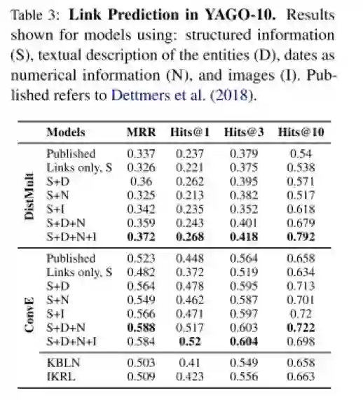 1 链接预测:可以看到在引入了实体文本描述,图片和数值之后,利用之前的嵌入模型,达到了SOTA的效果