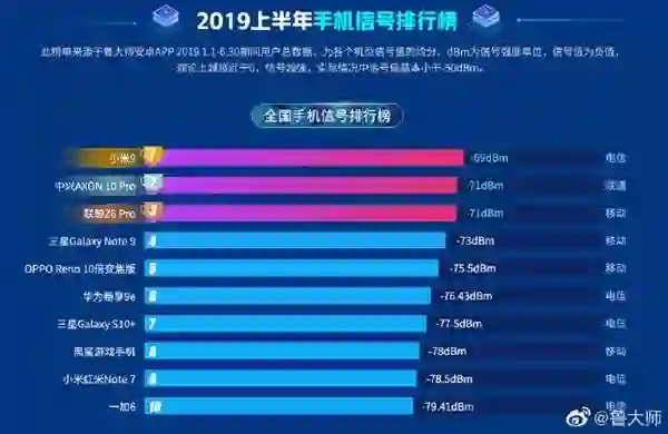 榜单显示,2019年上半年手机信号最好的前三名分别为小米9(电信、-69dBm)、中兴AXON 10 Pro(联通、-71dBm)、联想Z6 Pro(移动、-71dBm)。