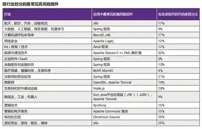 某些开源组件对开发人员来说非常重要,以至于这些组件在极大部分的应用中都能找到。今年,用于开发 HTML、CSS 和 JavaScript 的开源工具包 Bootstrap 出现在 40% 的全部被扫描应用中;紧随其后的是 jQuery,有36%的应用包括该开源组件。在各行业常见的组件中,值得注意的是 Lodash,这是一个为编程任务提供实用函数的 JavaScript 库。Lodash 是诸如医疗保健、物联网、互联网、市场营销、电子商务和电信等