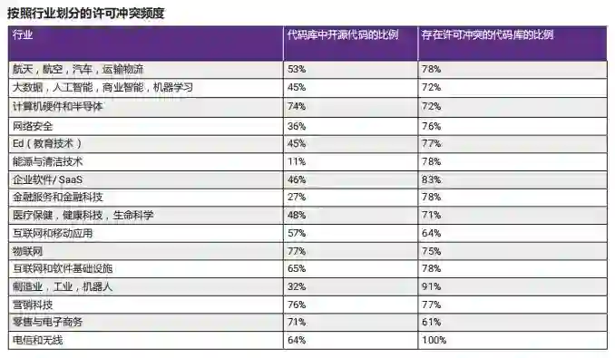 事实上,根据黑鸭按需审计集团(Black Duck On-Demand)提供的审计数据,所有垂直行业的企业都应该关注开源许可证问题,也应该关注由于未能遵守开源许可证协议而导致的代码知识产权诉讼或侵权(compromise)所带来的潜在风险。存在许可证冲突的应用在各个行业分布情况互不相同:在零售和电子商务行业中低至 61%,而在电信和无线行业则很高 – 他们 100% 的被扫描代码都存在某种形式的开源许可冲突。