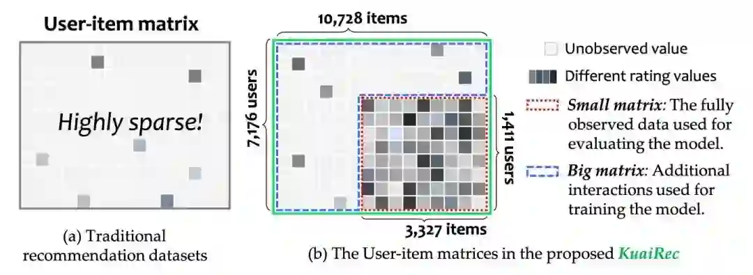 而我们首次提出了一个几乎全曝光的推荐数据集:KuaiRec,见下图: